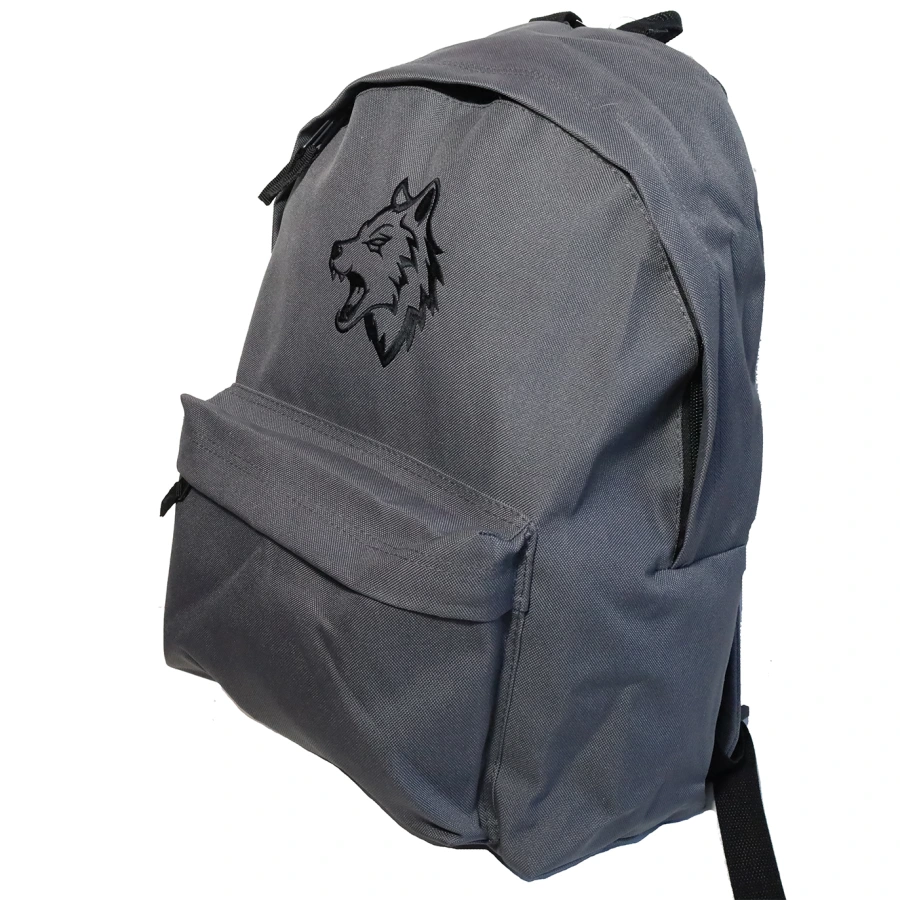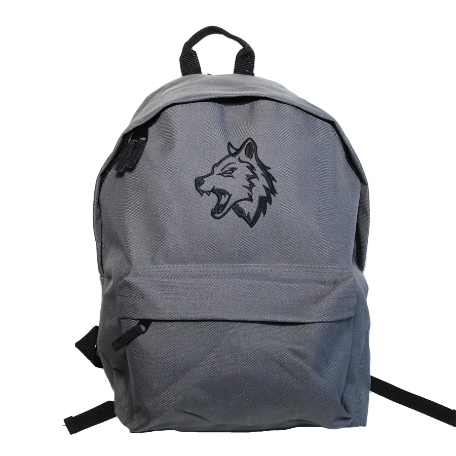 Batoh s výšivkou vlka.