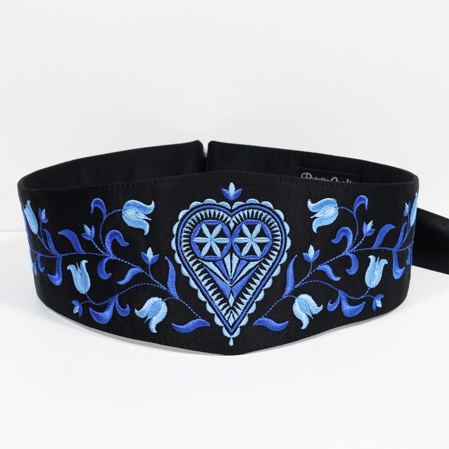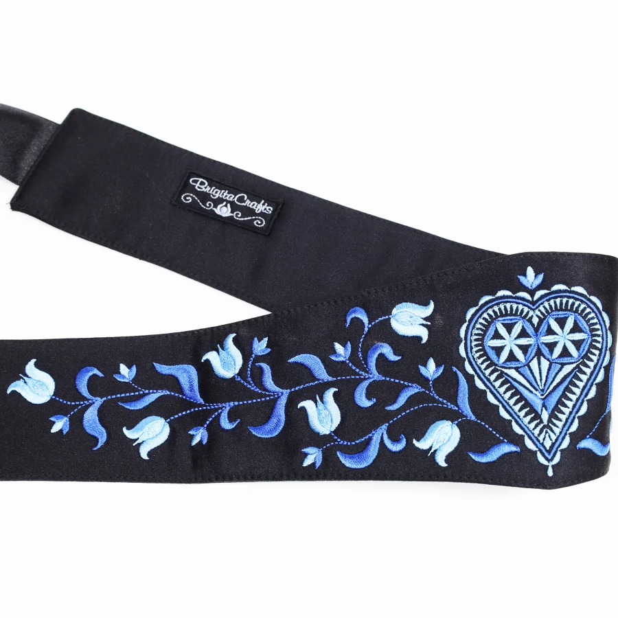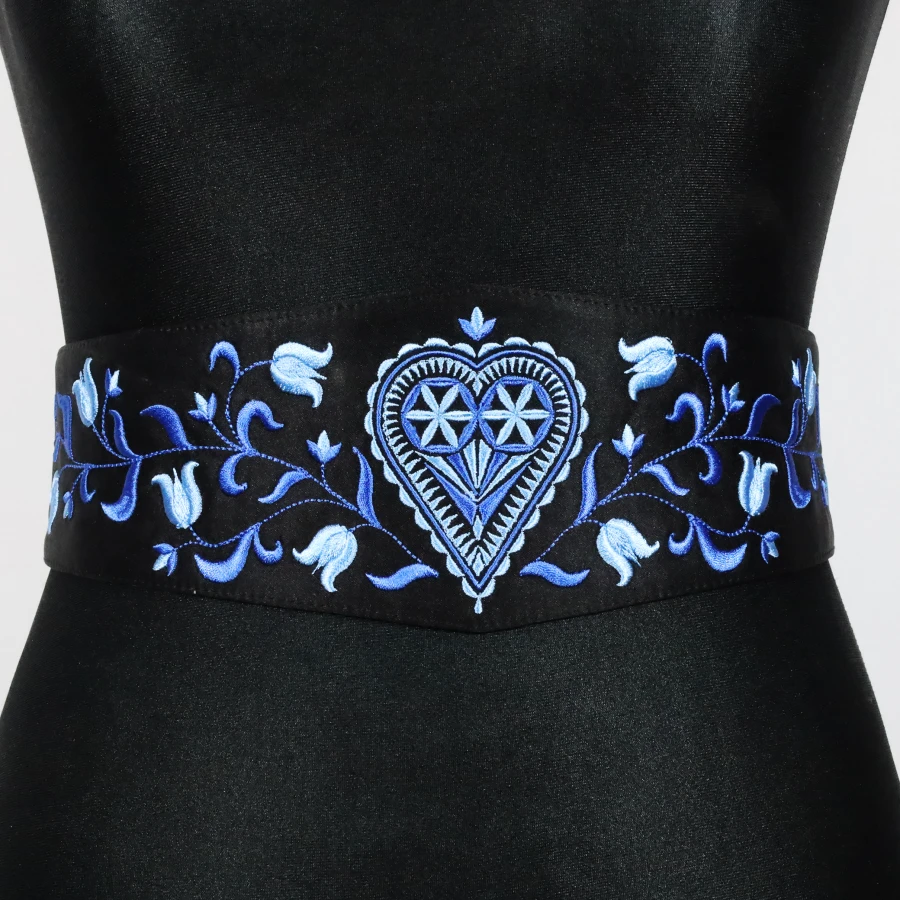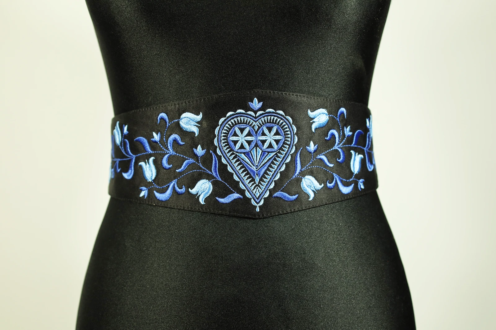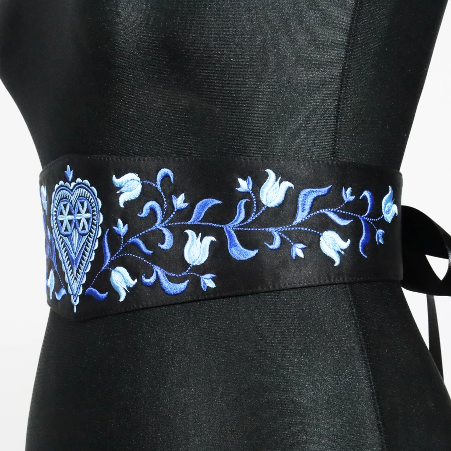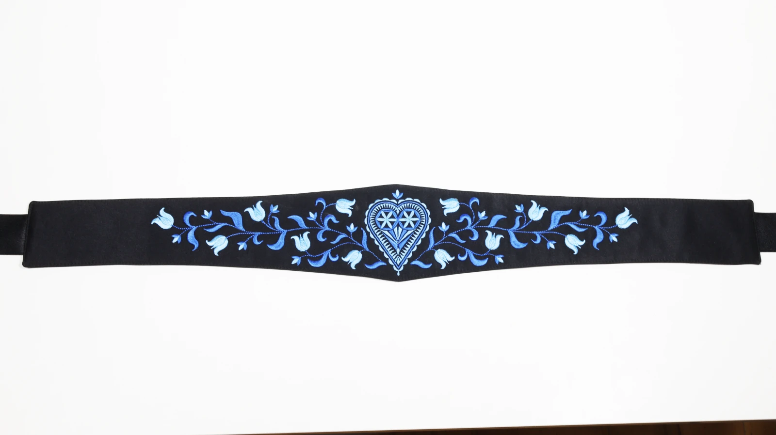 Dámsky vyšívaný opasok Slávka v čierno modrej kombinácií.