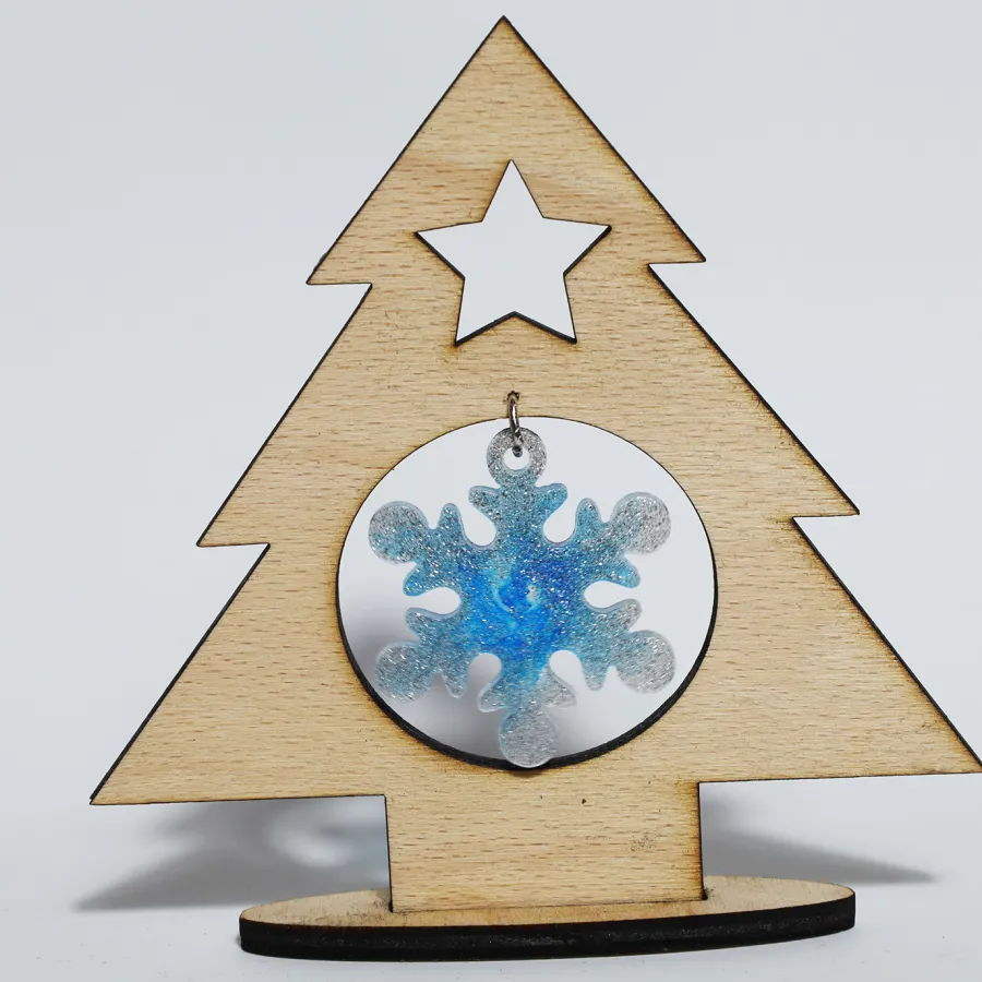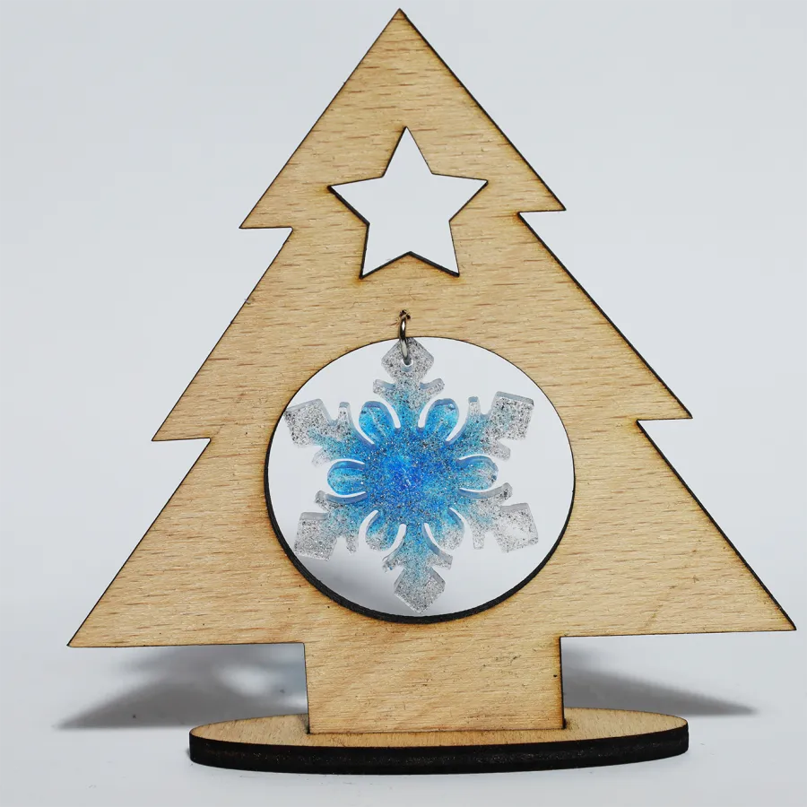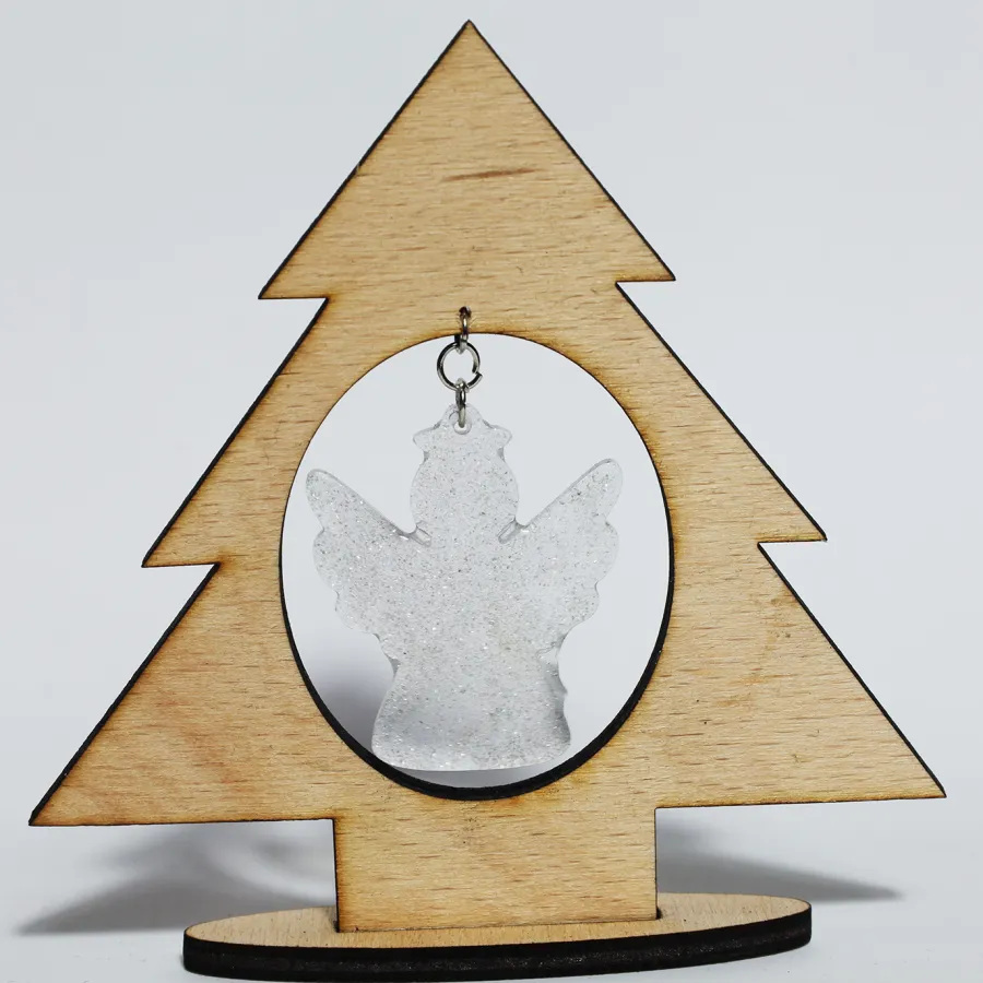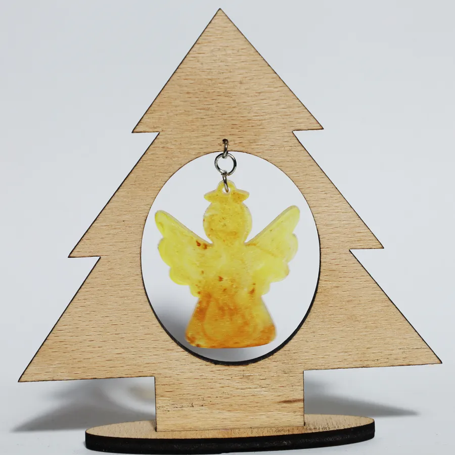 Vianočná živicová elegantná ozdoba, osadená v drevenom stromčeku.