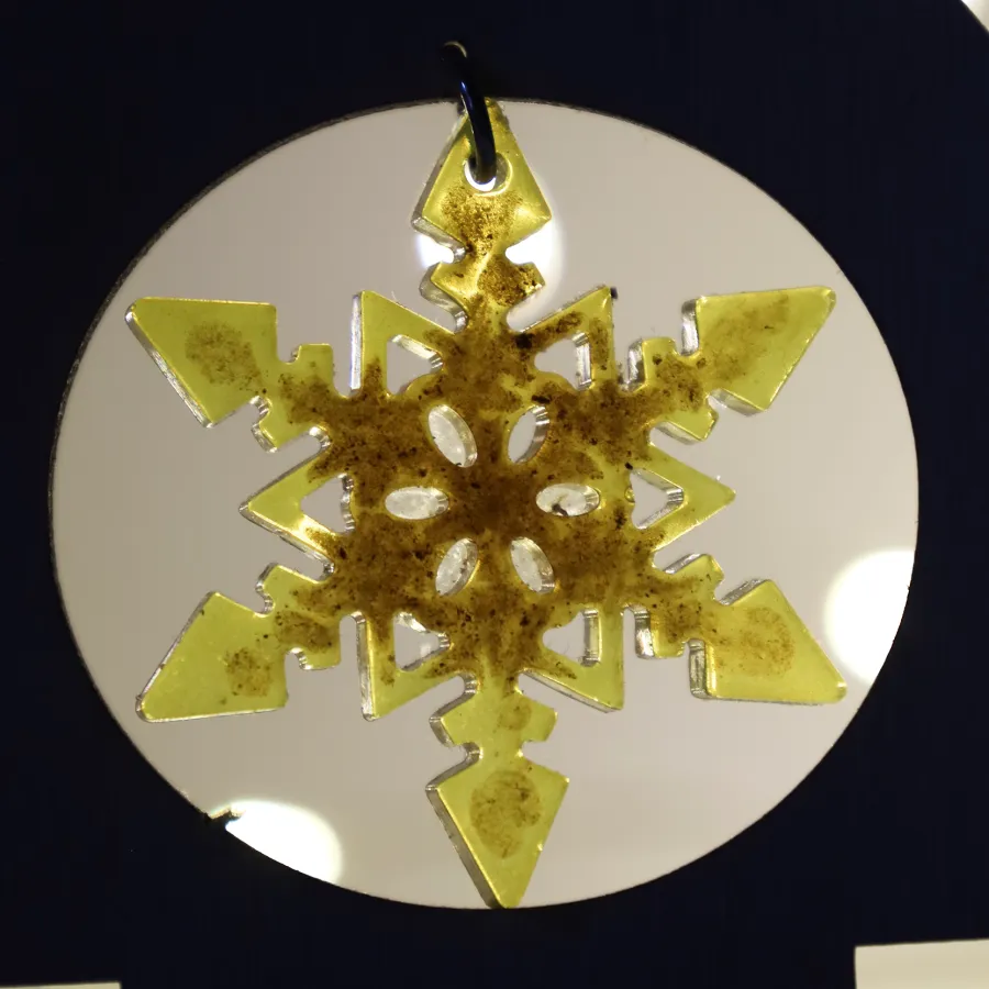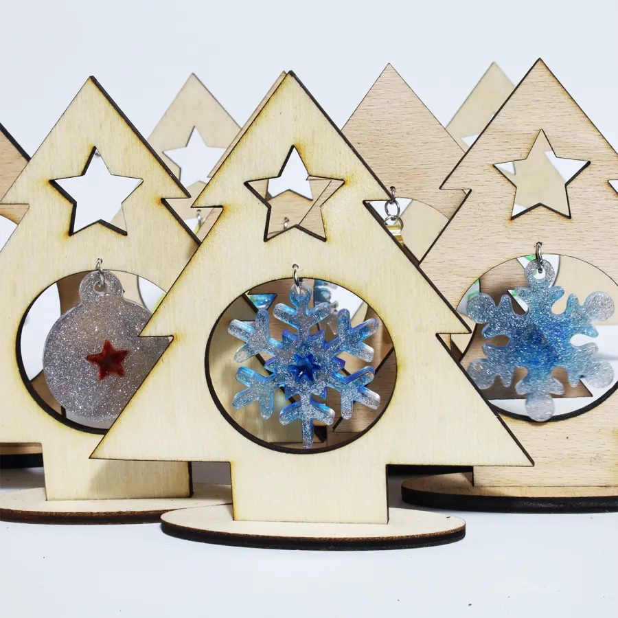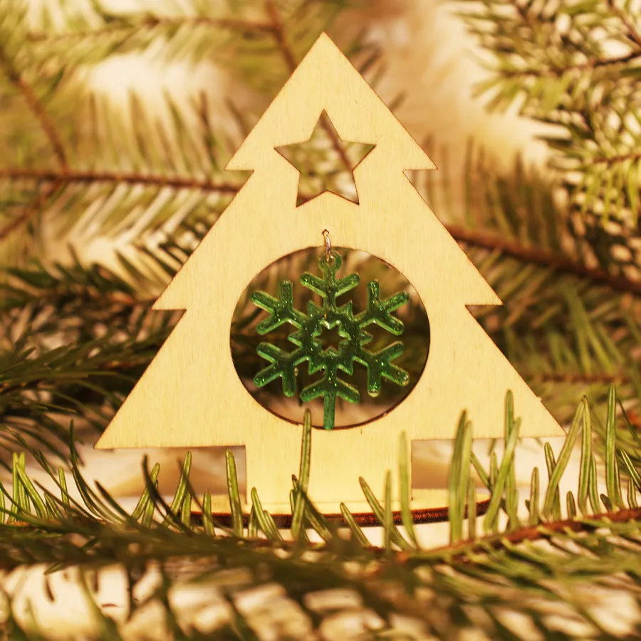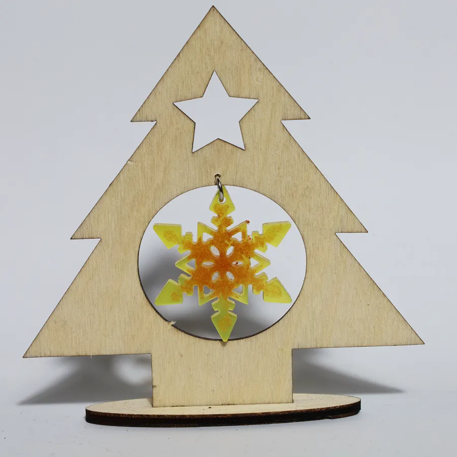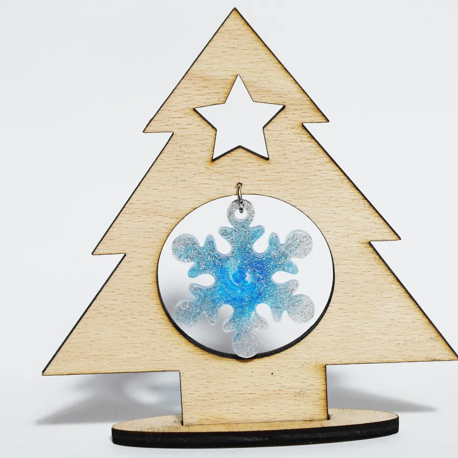 Vianočná živicová elegantná ozdoba, osadená v drevenom stromčeku.